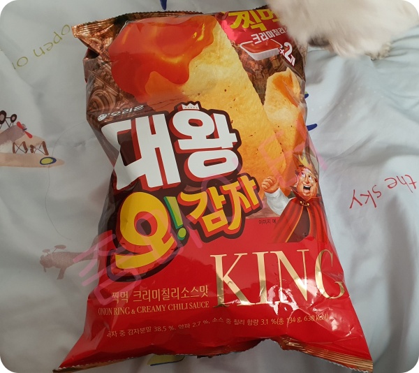그냥 오감자는 봤어도 대왕오감자는 처음이었어요. 크리미칠리소스맛인데 저는 소스에 안찍어 먹고 그냥 과자만 먹었습니다. 크기는 이름처럼 일반 오감자보다 훨씬 컸고 맛도 엄청 자극적이었습니다. 이런 걸 먹고 살을 뺀다는 생각을 하는 제자신이 우습지만 그래도 자극적이서 맛은 있더라구요. 하지만 많이는 먹지 못했습니다.