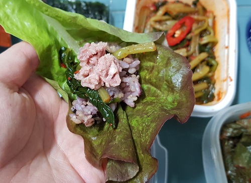 얼마전에 먹고 남은 상추가 있어서 쌈을 싸먹었습니다. 쌈장은 안넣고 그냥 밥이랑 참치 그리고 반찬 넣어서 먹는 쌈 은근히 맛있었어요. 예전에 어디서 봤는데 한끼에 5쌈이나 6쌈 만들어서 다이어트식으로 먹더라고요. 그거 살짝 따라 해봤습니다. 밥은 원래 한그릇 다 먹는데 조금 남겼어요. 배가 불러서 남긴 건 절대 아님!! ^^